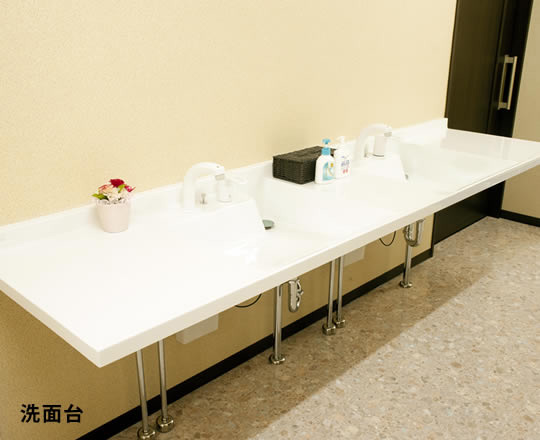 車椅子でも使い易いように設計した開放的な洗面台。