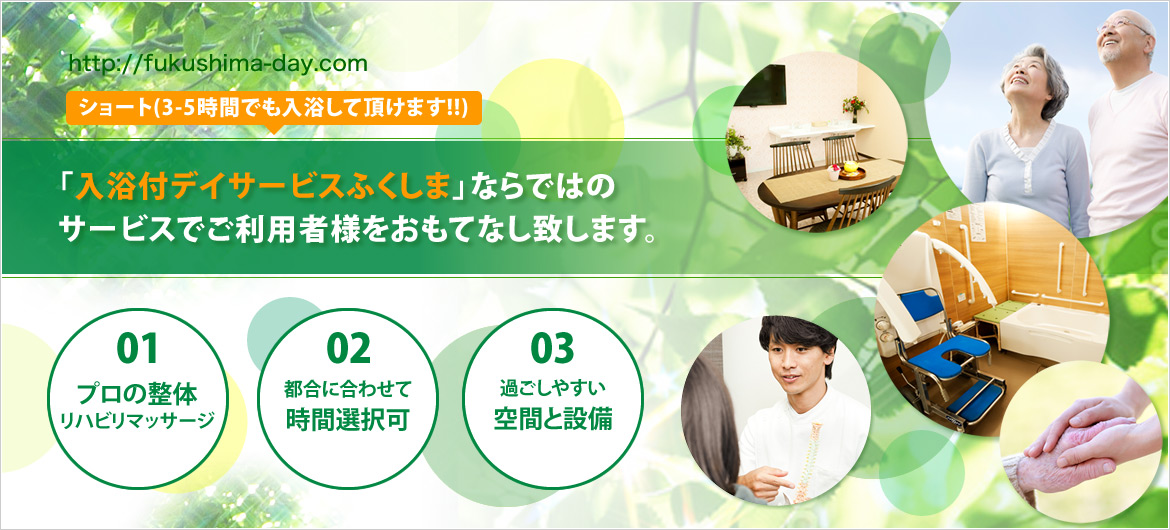 入浴付デイサービスふくしまでは、時間帯やコースをご利用者様の方で自由にお選びいただけます。 コースによってサービス内容が異なります。